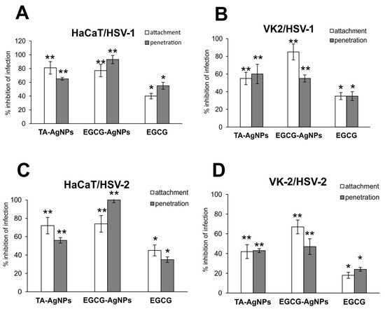 Interestingly, EGCG-AgNPs were more efficient than TA-AgNPs in inhibition of viral penetration in HaCaT cells and inhibition of viral attachment in VK-2 cells (
