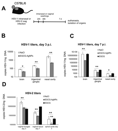 Male or female, 6- to 8-week-old C57BL/6 mice were used for all experiments. Mice were kept under standard environmental conditions. For HSV-1 infection, mice were anesthetized with isoflurane (Baxter, Tramco, Wolskie, Poland), and a total dose of 1 × 106 PFU of HSV-1 in 10 μL was given intranasally. At 24 and 48 h post infection, mice received intranasally 20 μL of 0.9% NaCl solution containing 20 μg/mL of EGCG-AgNPs or 0.9% NaCl solution.