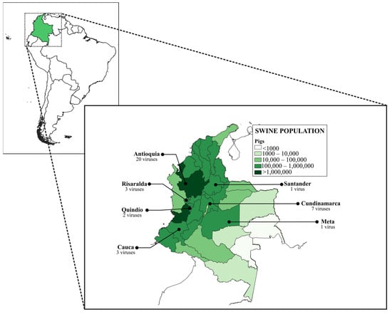 - Ramirez-Nieto, G.C.; Diaz Rojas, C.A.; Vera Alfonso, V.J.; Correa, J.J.; Mogollon Galvis, J.D. First Isolation and Identification of H1N1 Swine Influenza Viruses in Colombian Pig Farms. Health 2012, 4, 983–990. [Google Scholar] [CrossRef]