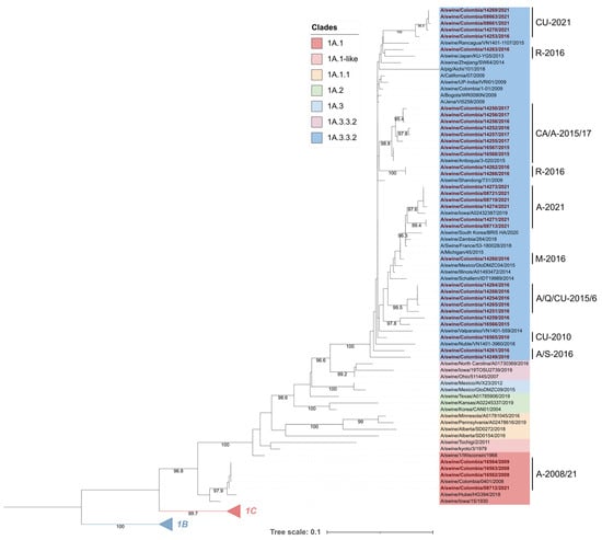 Phylogenetic analysis showed that Colombian viruses included in the study were grouped in the 1A lineage; 4 corresponded to the 1A.1 (α-H1) clade and 33 to the 1A.3.3.2 pandemic clade. The viruses in clade 1A.1 were placed into an early divergent branch into the lineage. These viruses were closely related to each other and constituted a monophyletic group, along with one strain from Asia (A/swine/Hubei/HG394/2018) and the ancient swine FLUAV A/swine/Iowa/15/1930 from North America (Figure 2).
