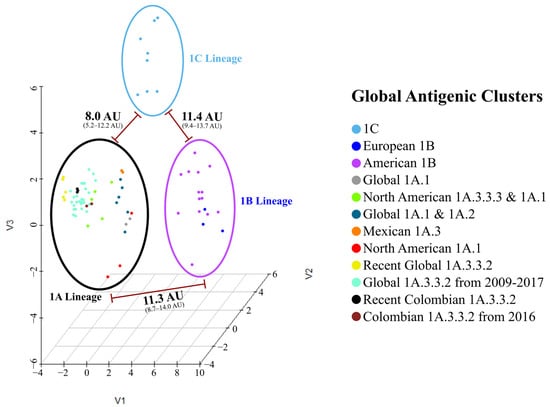 The classical clusters were Global 1A.1 (G1A.1), North American 1A.3.3.3 and 1A.1 (N1A.1–3), North American 1A.1 (N1A.1), Mexican 1A.3 (M1A.3), and Global 1A.1 and 1A.2 (G1A.1–2). G1A.1 was formed by viruses from the classical clade 1A.1 detected in the Americas between 1930 and 2021. In this group, the ancient strain A/swine/Iowa/17/19130, all classical Colombian viruses, and a virus from China detected in 2018 (A/swine/Hubei/HG394/2018) were allocated showing high antigenic stability (Figure 5). The N1A.1–3 group was diverse (Table 2) and included viruses from North America of the 1A.3.3.3 (γ-H1) and 1A.1 phylogenetic clades. The N1A.1 cluster comprised strains of the 1A.1 phylogenetic clade detected in the second half of the 2010s. This was the most divergent cluster, exhibiting an AD of approximately 8.0 AU, which suggests a lack of cross-reactivity with the others in the lineage. M1A.3 included two viruses of the γ-H1 phylogenetic clade identified in 2012 and 2015 in Mexico, notably (6.7 AU) distinct from other 1A.3 strains. The G1A.1–2 cluster contained strains of the 1A.1 and 1A.2 (β-H1) phylogenetic clades. These were subclustered according to a temporal pattern, with strains from the 2000s being grouped apart from the older viruses (Figure 5).