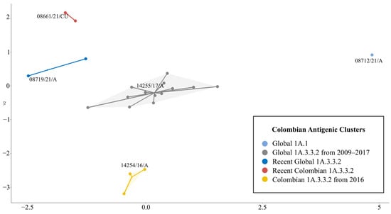 PDM-CO-16 cluster contained only four viruses from the Antioquia region identified in 2016. This group had a high antigenic relatedness. In the antigenic dendrograms and maps, this cluster was plotted near to the PDM09-17 (Figure 4, Figure 5 and Figure S2). However, based on the AD calculated between these two groups (3.7 AU), both were considered antigenically distinguishable. Nevertheless, a virus (14251/16/Q) from the PDM09-17 showed similarity to the PDM-CO-16 cluster by 1.7 AU.