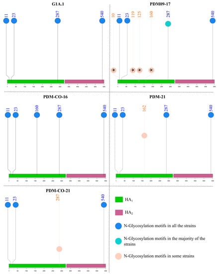 The presence of N-glycosylation motifs (NxS/T; where x is any amino acid but P) in the sequences was evaluated using the NetNGlyc-v1.0 tool from the Technical University of Denmark (DTU) (https://services.healthtech.dtu.dk/service.php?NetNGlyc-1.0; accessed on 2 April 2023). In this analysis, the entire amino acid sequence of each HA (HA1 numbering) was used. Only motifs with an N-glycosylation potential > 0.5 were considered as potentially modifiable sites.