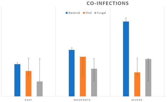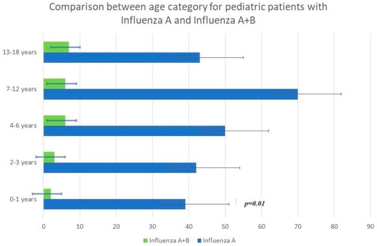 When comparing the severity of influenza in children of different ages, the clinical symptoms of the illness, such as fever, malaise, cough, rhinitis, headache, etc., as well as the consequences, vary due to the virus type and subtype [,,,]. These variables make it extremely difficult to distinguish between them clinically and to start effective management based on contemporary medical care to lower morbidity [,,,]. To help clarify the issue, we conducted a study that compared the clinical forms (easy, moderate, and severe) based on the age groups, clinical symptoms, and treatment in a pediatric population with influenza and influenza with co-infections. The relevance of these respiratory disorders and the clinical manifestation of viral co-infections are more likely to be found in children who have been diagnosed with influenza A + B viruses, who have more severe clinical symptoms, and need hospitalization more frequently and for a long time [,,]. Children who have chronic diseases and other medical conditions are more likely to experience complications from influenza than healthy children []. Several pulmonary and extrapulmonary problems, such as myocarditis and pericarditis, myositis or rhabdomyolysis, and seizures, might occur [,,,,].
