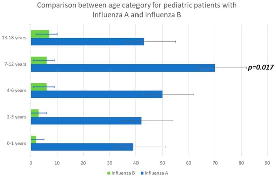 Comparison of influenza incidence rate, by age, between influenza A and B. (p = 0.017).