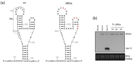 γRE is a three-way branched RNA element that contains a pseudoknot (PK1) formed between the loop sequence of the top-left hairpin (tlH) and its upstream stretch sequence (Figure 1a). PK1 is completely conserved in all CMV-associated satRNAs reported and is essential for satRNA survival in plants [37]. The top-right hairpin (trH) in γRE is required for satRNA to inhibit CMV accumulation [37]. Here, we introduced mutations into the γRE element to disrupt both PK1 and trH in the background of sat-T1 (Figure 1a) and tested its viability in the presence of its helper virus Fny-CMV in N. benthamiana plants. Northern blotting analyses showed that CMV RNA3 was detected markedly in local leaves inoculated with CMV and either wild-type sat-T1 or its γRE mutant (T1-γREm) (Figure 1b). As expected, sat-T1 was detected substantially, and T1-γREm was undetectable in three independent leaf samples (Figure 1b), demonstrating that the mutated γRE is inactive in supporting sat-T1 replication. This is consistent with our previous work [37].