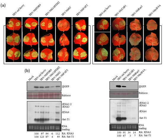 Then, we tested co-infection with sat-T1 and the GFP-expressing CMV variant (CMV-gfp) in the upper systemic leaves of these plants with down-regulated host mRNAs. GFP fluorescence showed that the leaves with down-regulated NbPDR9, NbGAPDH2, NbPAP2, or NbZAR1 displayed a level of GFP fluorescence strength similar to that produced from the TRV-mCherry control, while the leaves with down-regulated NbH3, NbRan3, or NbeIF4A showed extremely weak or invisible GFP fluorescence (Figure 3a). In general, the GFP fluorescence observed was consistent with the relative levels of GFP and the GFP-expressing RNA3 in these leaves (Figure 3b). These results indicated that the down-regulation of NbH3, NbRan3, or NbeIF4A was detrimental to CMV infection, resulting in the poor accumulation of sat-T1 (Figure 3b). Although the down-regulation of NbPDR9, NbGAPDH2, NbPAP2, or NbZAR1 had no or limited effects on CMV RNAs, it altered the level of sat-T1 diversely. The down-regulation of NbPDR9 increased the level of sat-T1 by 23%, while the down-regulation of the other three genes reduced the level of sat-T1 (13–45%). These results suggested that these four host proteins may regulate the replication of sat-T1 in plants. We also cannot rule out the possibility that NbH3, NbRan3, or NbeIF4A is directly involved in the replication of sat-T1.