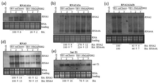 Agrobacterium cells were cultured in Luria-Bertani liquid media containing 50 ng/mL kanamycin and 25 µg/mL rifampin at 28 °C. The cells carrying 35S:TRV1 were equally mixed with those carrying each 35S:TRV2 variant and infiltrated into the fifth leaves of approximately 3–4-week-old N. benthamiana plants. When the plants inoculated with the bacteria cells carrying 35S:TRV1 and 35S:TRV2-NbSu (TRV2 carrying a portion of the endogenous Su gene) displayed extensive yellowing in the upper systemic leaves, the upper systemic leaves of the plants infiltrated with the cells harboring 35S:TRV1 and 35S:TRV2 variants were infiltrated with the Agrobacterium cells harboring the infectious clone of pCb301-F109 for Fny-CMV RNA1, pCb301-F209 for Fny-CMV RNA2 and pCb301-F309-gfp for Fny-CMV RNA3 expressing GFP, or pCb301-sat-T1 for the isolate T1 of satRNA (sat-T1) as described previously [37,41]. At 3 days post-infiltration (dpi), the infiltrated leaves were photographed under UV light and collected for immunoblots and RNA gel blots. To test the contributions of host proteins to the replication of CMV and satRNA, we conducted trans-replication assays as described previously [37,41]. Briefly, a mixture of Agrobacterium cells was infiltrated into the leaves of the TRV-inoculated N. benthamiana plants as aforementioned, to transiently co-express CMV replicase components (1a and 2a) and the RNA silencing suppressor p19 encoded by tomato bushy stunt virus (TBSV), together with CMV RNA1Δ1a lacking 1a expression, RNA2Δ2a lacking 2a expression, RNA2Δ2a2b expressing neither 2a nor 2b, wild-type RNA3, or sat-T1. At 3 dpi, total RNAs were extracted from the infiltrated leaf tissues and subjected to RNA gel blotting analyses as described below.