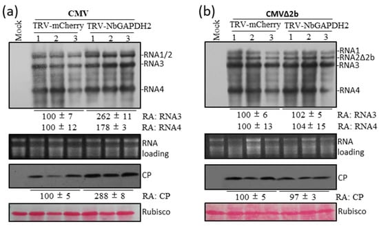 The finding that CMV 2b influenced GAPDH2’s regulation of the accumulation of RNA2 prompted us to test the accumulation levels of CMV and its 2b-deletion mutant CMVΔ2b in GAPDH2-silenced or control plants. As mentioned earlier, GAPDH2 was down-regulated in N. benthamiana plants by inoculating them with TRV-GAPDH2. Ten days later, CMV and CMVΔ2b were separately inoculated via agroinfiltration on the upper leaves of the GACP2-silenced or control (TRV-mCherry) plants, and they were detected in the infiltrated leaves at 3 dpi using RNA gel blots and immunoblots. In the case of CMV, the down-regulation of GAPDH2 increased the accumulation levels of viral RNAs by over 78% and the CP by 178%, compared with the control (TRV-mCherry) (Figure 5a). These data confirm the important role of 2b in GAPDH2’s regulation of CMV accumulation. However, we did not observe a discernable difference in the accumulation levels of CMVΔ2b between the GAPDH2-silenced and the control plants (Figure 5b), suggesting that the unsilenced amounts of GAPDH2 or its homologs (GAPDH1 and GAPDH3) could be sufficient for the replication of CMVΔ2b in the GAPDH2-silenced plants.