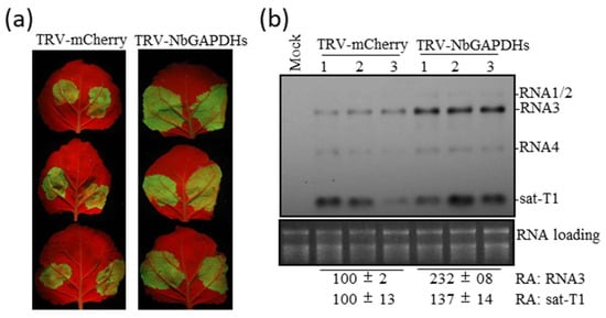 Simultaneous down-regulation of three GAPDH homologs increased the accumulation of GFP-expressing CMV variant (CMV-gfp) and sat-T1 in N. benthamiana. (a) Observation of GFP fluorescence. N. benthamiana plant leaves were pre-inoculated with either TRV-mCherry or TRV-NbGAPDHs via agroinfiltration. At 10 days post-infiltration (dpi), the upper expanded leaves were infiltrated with Agrobacterium cells for co-inoculation with CMV-gfp and sat-T1. Leaves were photographed under UV light at 3 dpi. Inoculation with TRV-GAPDHs was performed by infiltrating plants with a bacterial cell mixture harboring TRV1 with TRV2-GAPDH1, TRV2-GAPDH2, and TRV2-GAPDH3 together. (b) Northern blotting analyses of viral RNAs and sat-T1 in the infiltrated leaves. Total RNAs were extracted from the infiltrated leaves at 3 dpi. CMV RNAs and sat-T1 were simultaneously detected by co-incubating probes for CMV and sat-T1 in the RNA hybridization. Ribosomal RNAs were used as loading assessment for Northern blot analyses. Relative accumulation (RA) values of RNA3 and sat-T1 are shown at the bottom.