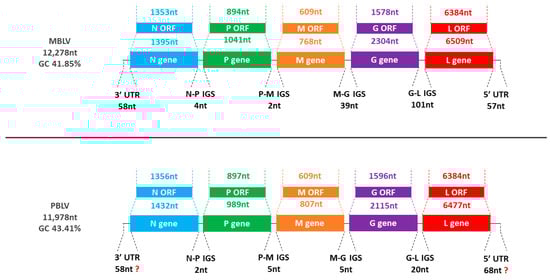 Representation of MBLV and PBLV genome organization. The schematic representation illustrates the genome size, GC content, gene order (N-P-M-G-L), and the length of each gene, open reading frame (ORF), intergenic sequence (IGS), and untranslated region (UTR).