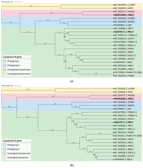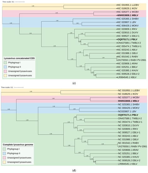 Phylogenetic analysis confirmed that MBLV and PBLV group with the unassigned and phylogroup I lyssaviruses, respectively. All phylogenetic trees infer that MBLV and WCBV were closely related with the tree topology, remaining consistent (Figure 2a–d). IKOV and LLEBV were located on a clade separate from MBLV and WCBV in all phylogenetic trees and may constitute a separate phylogroup (Figure 2a–d). Interestingly, the topology of the clade containing PBLV differed depending on the genomic region analyzed. Phylogenetic analysis based on the N gene suggests that PBLV was most closely related to TWBLV-1 but was also closely related to DUVV, EBLV-1, and TWBLV-2 (Figure 2a); however, a change in the topology occurred in the phylogenetic analysis based on the G gene, and PBLV grouped with DUVV, EBLV-1, and IRKV (Figure 2b). Phylogenetic analysis based on the concatenated N + P + M + G + L CDS and complete genome sequence suggests that PBLV was most closely related to TWBLV-1 and TWBLV-2 but was located on a separate branch (Figure 2c,d). Based on phylogenetic inference, PBLV is closely related, yet distinct from TWBLV-1 and -2.