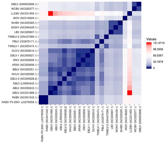 Heatmap illustrating the antigenic distance estimations between representative lyssaviruses. Antigenic distance estimations were calculated to demonstrate the similarity among the antigenic sites on the G protein among representative lyssaviruses. Lyssaviruses with identical antigenic sites are represented by a score of zero, which is indicated in dark blue. An increase in the score represents more dissimilar antigenic sites, as indicated by the scale. The most dissimilar antigenic distance estimates are indicated in red.