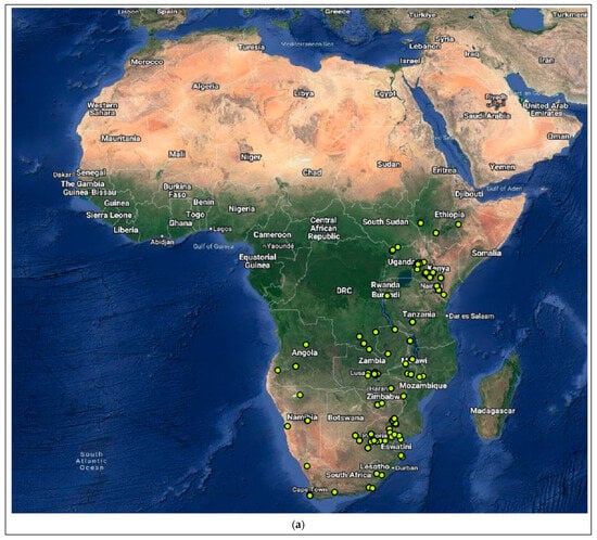 The ecological niches of M. natalensis (A. Smith, 1833) [] and N. schlieffeni (Peters, 1859) [] were determined by examining the existing literature and mapping occurrence data obtained from the Global Biodiversity Information Facility (GBIF), available at https://www.gbif.org/ (accessed on 14 and 24 May 2023) [,]. A total of 1238 occurrence records were available for M. natalensis; however, only 888 were georeferenced records, of which 4 records were excluded due to invalid coordinates. A total of 507 occurrence records were available for N. schlieffeni; however, only 277 were georeferenced records, of which 4 records were excluded due to invalid coordinates. The mapping of M. natalensis and N. schlieffeni distribution was performed using QGIS V3.28.2 [] with the Google hybrid layer, available at http://mt0.google.com/vt/lyrs=y&hl=en&x={x}&y={y}&z={z} (accessed on 24 March 2023). The distribution of the Miniopterus schreibersii (Natterer, 1819; Schreibers’ long-fingered), Pipistrellus abramus (Temminck, 1838; Japanese pipistrelle), and N. p. velutinus (Allen, 1923; Chinese noctule) bats were mapped to determine if any overlap in the distribution of the host species of the most closely related lyssaviruses to MBLV and PBLV exist, as described for M. natalensis and N. schlieffeni [,,]. Of the 22134, 3402, and 95 occurrence records available for M. schreibersii, P. abramus, and N. p. velutinus, only 21,781, 1589, and 28 were georeferenced records, respectively. All records with invalid coordinates were excluded.