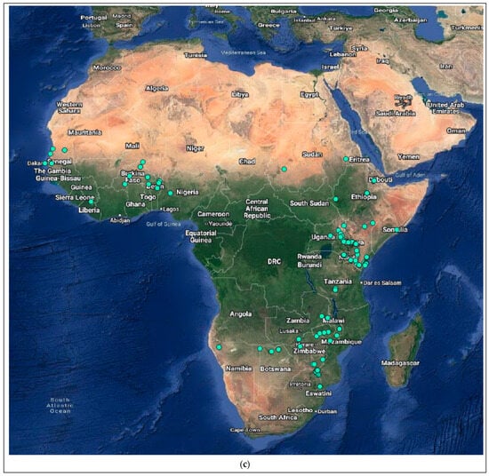 The Miniopterus and Nycticeinops genera previously belonged to the family Vespertilionidae in the subfamilies Miniopterinae and Vespertilioninae, respectively; however, due to significant morphological, embryological, immunological, and genetic differences between miniopterine bats and other vespertilionids, the Miniopterinae subfamily was elevated to full family status and no longer form part of the family Vespertilionidae []. Significant differences were demonstrated between M. natalensis, previously a subspecies of M. schreibersii, and M. schreibersii [,,], and subsequently, M. natalensis was elevated to full species rank after phylogenetic analysis confirmed that these two species are genetically distinct []. M. natalensis and N. schlieffeni have a primarily African distribution with limited records from the Arabian Peninsula, including Saudi Arabia and Yemen [,,,,]. The mapping of georeferenced records for M. natalensis suggest a widespread distribution, particularly in southern and eastern Africa, and suggest its presence in at least Angola, Botswana, Burundi, the Democratic Republic of the Congo, Ethiopia, Kenya, Lesotho, Malawi, Mozambique, Namibia, South Africa, Tanzania, Uganda, Zambia, and Zimbabwe (Figure 4a), whereas the distribution of M. schreibersii, the host species of the most closely related virus to MBLV, is largely confined to Europe (Figure 4b). However, due to the frequent misidentification of M. natalensis and M. schreibersii, the revision of records may be required to confirm its distribution. In addition, M. arenarius, previously considered a subspecies of M. natalensis described in East Africa, is likely a distinct species []. M. natalensis was listed as a species of least concern by the International Union for Conservation of Nature (IUCN) in 2017 due to its wide distribution and presumed large population numbers and is considered to be unlikely to decline fast enough to justify listing it in a more threatened category []. The mapping of georeferenced records for N. schlieffeni suggests a widespread but disjunct distribution and suggests its presence in at least Benin, Botswana, Burkina Faso, Ethiopia, Guinea, Kenya, Malawi, Mauritania, Mozambique, Namibia, Nigeria, Senegal, Somalia, South Africa, Sudan, Tanzania, Uganda, Zambia, and Zimbabwe (Figure 4c). However, the presence of N. schlieffeni has also been reported in Angola, Cameroon, Central African Republic, Chad, Côte d’Ivoire, the Democratic Republic of the Congo, Djibouti, Egypt, Eritrea, Eswatini, Ghana, Mali, Niger, and Togo [,,,,,,,,,], whereas the distribution of P. abramus and N. p. velitunus, the host species of the most closely related viruses to PBLV, is largely confined to eastern Asia (Figure 4d,e). N. schlieffeni was listed as a species of least concern by the IUCN in 2017 due to its wide distribution and lack of major threats [].