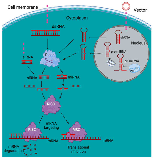 Schematic illustration of RNAi pathway (endogenous and exogenous). The siRNA and miRNA pathways are denoted by solid and dotted arrows, respectively. In the siRNA pathway, Dicer cleaves dsRNA to produce siRNAs in the cytoplasm. These siRNAs are integrated into the RISC complex and then unwound into two single-stranded RNAs known as the passenger and guide strand. The guide strand stays inside the RISC to control the sequence-specific decay of complementary mRNA while the exonucleases break down the passenger strand. On the other hand, the miRNA pathway starts with endogenously encoded pri-miRNAs, which are then transcribed by RNA polymerase II and trimmed by Drosha to produce pre-miRNAs. These precursors are subsequently transported to the cytosol where Dicer cleaves them to create miRNAs. Similar to the siRNA pathway, the miRNA duplex unwinds and one of the strands, the so-called mature miRNA, assembles into RISC, causing either mRNA breakage or translation inhibition, depending on the degree of similarity between the miRNA and the mRNA target. Exogenous RNAi triggers (pink dashed arrows), such as vector-based shRNAs and synthetic dsRNAs, siRNAs, and miRNAs, may also induce RNAi.