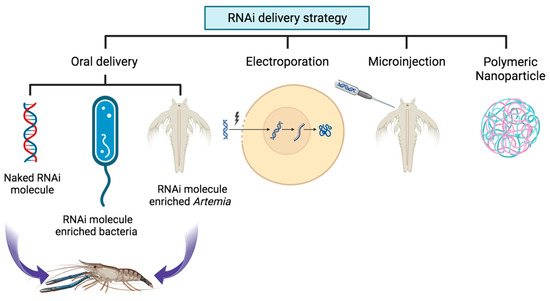 The administration of RNAi therapeutic molecules through oral delivery has shown success in various arthropod species. This can be achieved by delivering the molecules in a naked form, conjugated with a polymer, or using bacteria that carry specific dsRNA/siRNA. Additionally, incorporating the molecules into the feed of fish or shellfish has also been effective [147,148,149]. The utilization of nanoparticulate RNAi to specifically target the WSSV vp28 gene resulted in significant antiviral efficacy. The study successfully suppressed the gene’s activity in both healthy and diseased models, providing substantial protection against viral challenges [150]. The most effective delivery of RNAi molecules has been achieved by the oral intake of dsRNA-enriched bacteria and viable brine shrimp (Artemia) zygotes [135]. However, the oral route stands out as the most encouraging approach for delivering RNAi in aquatic environments [151].