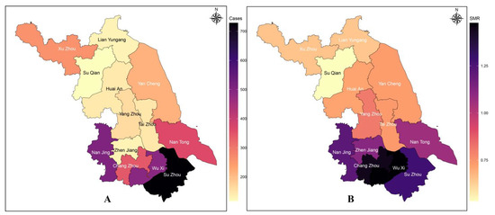 Disease map of the number of newly reported HIV/AIDS patients (A) and the standardized reporting rate (B) in Jiangsu Province in 2021.