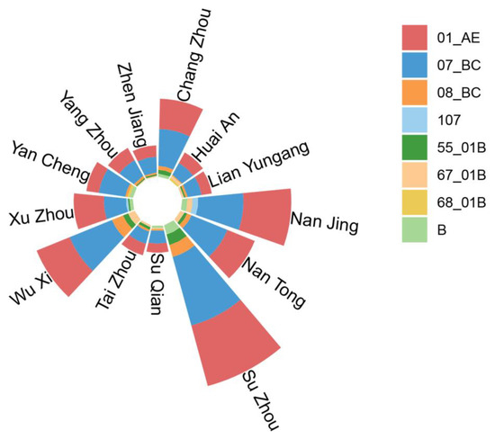 Composition of the top five HIV-1 subtypes in 13 cities in Jiangsu Province.