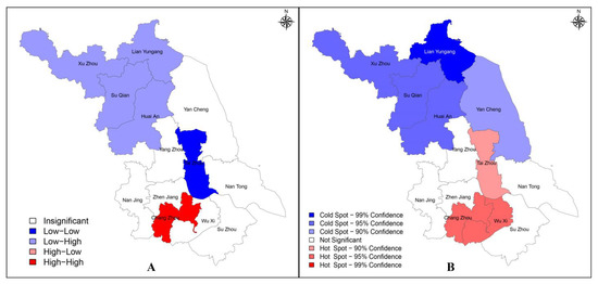 As can be seen from Figure 3, Chang Zhou showed a High–High clustering pattern, Tai Zhou showed a Low–Low clustering pattern, and Xu Zhou, Su Qian, Huai An, and Lian Yungang showed a Low–High clustering pattern. At the 99% CI, only one cold spot was identified in Lian Yungang; at the 95% CI, Chang Zhou and Wu Xi were identified as hot spots, while Xu Zhou, Su Qian, and Huai An were identified as cold spots; at the 90% CI, Tai Zhou and Yan Cheng were identified as hot and cold spots, respectively.