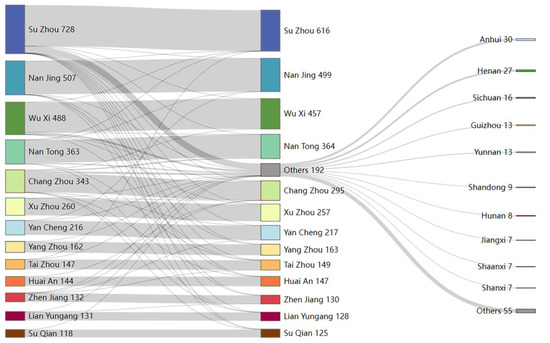 Except for Huai An, from which only 1 patient went to Chang Zhou after diagnosis, the remaining 12 cities reported 192 patients moving out of the province, involving 28 of the 32 provincial administrative regions in mainland China, and the main destination provinces were Anhui, Henan, Sichuan, Guangzhou, and Yunnan.