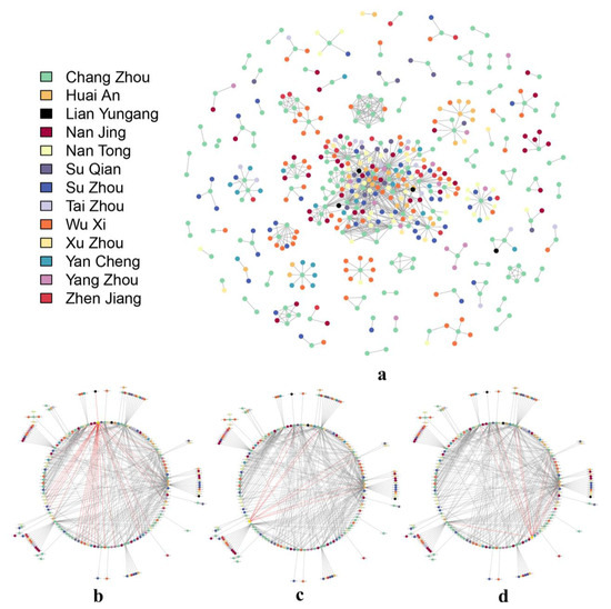 Eight patients moved between cities during ART in the largest cluster, and three of whom were linked to patients in the destination cities in the largest network. The first patient, reported by Chang Zhou, whose usual residence at the first follow up was reported as Huai An, was linked to 30 other sequences (3 sequences from Huai An) in the molecular transmission network (Figure 5b). The second patient, reported by Huai An, whose usual residence at the first follow up was reported as Chang Zhou, was linked to 12 other sequences (11 sequences from Chang Zhou) in the molecular transmission network (Figure 5c). The third patient, reported by Su Zhou, whose usual residence at the first follow up was reported as Chang Zhou, was linked to 10 other sequences (9 sequences from Chang Zhou) in the molecular transmission network (Figure 5d).