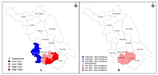 LISA clusters map (A) and cold–hot spots map (B) of standardized HIV/AIDS reporting rate in Jiangsu Province in 2021.