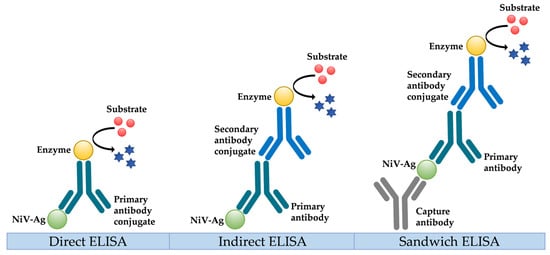 Due to their more complicated use compared to RT-PCR, need of specific reagents, and longer implementation time, serological tests are more commonly used in epidemiological studies and surveillance activities with no ongoing NiV acute infections. Several tests have thus been implemented over the years to detect NiV IgG and IgM. These tests can generally differentiate NiV from HeV [,,,].