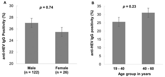 Distribution of seroprevalence of anti-HEV IgG and IgM based on sex (A) and age (B). Data are provided as percentages. No significant differences were observed between sex (p = 0.74) and age (p = 0.23).