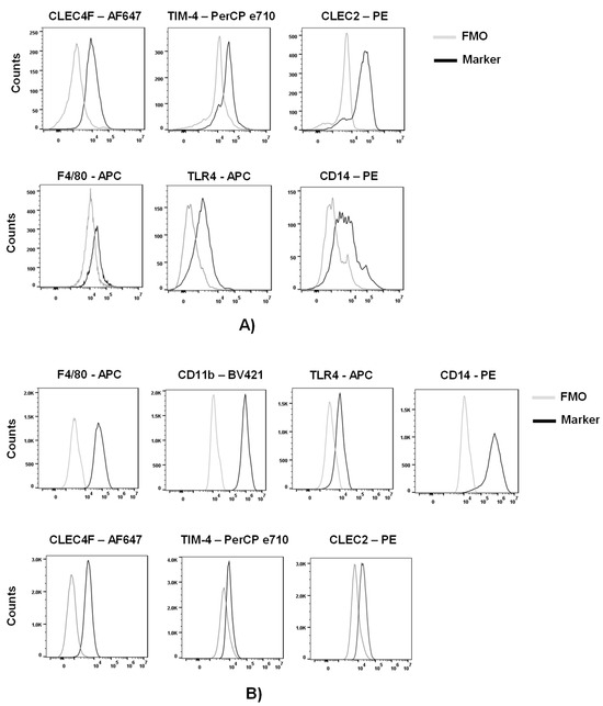 Primary KCs and ImKCs were immunostained for surface markers. Fixable Viability Dye eFluor 780 (1:1000, #65-0865), CD11b BV421 (1:75, clone M1/70, #404-0112-80) and TIM-4 PerCP eFlour 710 (1:75, clone RMT4-54, #12-5866-82) were purchased from Thermo Fisher (Thermo Fisher Scientific, Waltham, MA, USA). CD45.2 PE (1:5, clone 104, #109808), CD45.2 BV421 (1:75, clone 104, #109831), F4/80 APC (1:75, clone BM8, #123116), CLEC4F AF647 (1:75, clone 3E3F9, #156803), CLEC2 PE (1:75, clone 17D9/CLEC-2, #146103), CD14 PE (1:75, clone Sa-14-2, #123309), TLR4 APC (1:75, clone SA15-21, #145405) were purchased from BioLegend (San Diego, CA, USA). Unstained cells as well as fluorescent minus one (FMO) control samples were used as controls on every staining. All stainings were performed in the presence of the Fc receptor’s blocker monoclonal antibody (Bio X Cell, Lebanon, NH, USA, 20 μg/mL, clone 2.4G2, #BE0307). Samples were measured on a CytoFLEX cytometer (Beckman Coulter, Brea, CA, USA). Data were analyzed using the FlowJo software v10.8.2 (BD Biosciences, Franklin Lakes, NJ, USA).