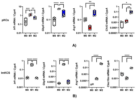 Similarly, following 24 h IFN-γ and/or IL-4/IL-13 treatment, ImKCs polarized towards M1-like or M2-like phenotype, respectively (Figure 2B). Treatment with IFN-γ significantly elevated levels of Irf-1 and Gbp5 when compared to non-treated ImKCs. Moreover, significantly elevated levels of Arg-1 transcripts were found in M2a-polarized ImKCs. Macrophage galactose-type lectin (Clec10A), another known M2a-associated marker [31], was significantly upregulated in M2a ImKCs when compared to M0 and M1 polarized ImKCs. Of note, basal (M0) levels of these activation markers were notably higher in the primary KCs compared to the immortalized cells. This may be due to a generalized activation of primary KCs that occurs during the isolation procedure. In total, these findings show that, similarly to primary macrophages, ImKCs can be polarized towards M1- and M2a-like cells.