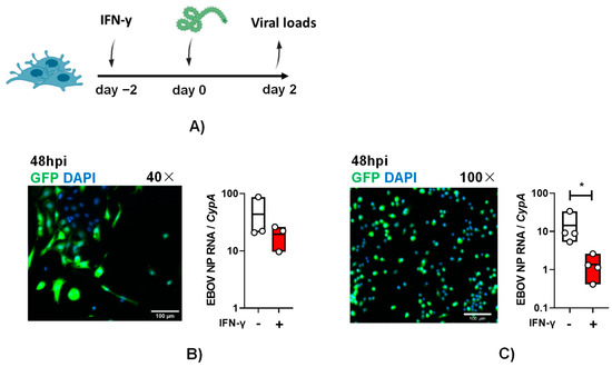 Primary and immortal Kupffer cells support EBOV infection and IFN-γ pretreatment decreases virus infection of ImKCs. (A) Schematic of study. Primary KCs (B) or ImKCs (C) were left untreated or treated with IFN-γ (20 ng/mL) for 48 h and then infected with 1 × 104 EBOV-eGFP particles (n = 3, three independent biological experiments conducted at maximum containment laboratory). Shown in panels (B,C) are virus-driven GFP expression (micrographs) and viral loads after 48 hpi. Gene expression levels of EBOV NP were determined by qRT-PCR of cell lysates with cyclophilin A used as a reference gene. p-values were obtained by unpaired one-tailed t-test. (* p < 0.05). (A) Created with BioRender.com.