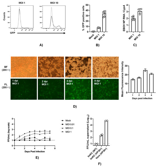 ImKCs-VP30 are susceptible and permissive to EBOV ΔVP30 infection. (A,B) ImKCs-VP30 cells were infected with an MOI of 1 or 10 with EBOV ΔVP30 for 60h (n = 3, three independent biological experiments). (A,B) GFP expression was determined by flow cytometry. (C) Gene expression levels of EBOV NP were determined by qRT-PCR. Cyclophilin A was used as a reference gene. Data represents the mean ± SD. (D) GFP expression over the course of a 4-day infection. Shown are 200× micrographs of white (top panel), fluorescent (bottom panel) light images and quantification of mean fluorescence intensity by ImageJ v1.54d (right panel). (E) Infectious virus present in supernatants collected over time beginning with an MOI of 0.01 to 1. Supernatants were titered on Vero-VP30 cells. (F) A comparison of infectious virus produced in supernatants on day 5 from ImKCs, ImKC-VP30s and Vero-VP30 cells infected with an MOI of 0.1 of EBOV ΔVP30.