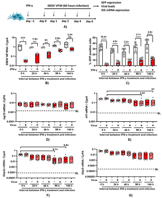 EBOV ΔVP30 infection in ImKC-VP30 cells is inhibited by IFN-γ and the effect is gradually reduced over time. EBOV VP30-expressing ImKCs were polarized with IFN-γ (20 ng/mL) for 24 h, media replaced and EBOV ΔVP30 infection and expression of four ISGs were analyzed at the different times noted. (A) Schematic of the experiment. (B) Expression of EBOV NP following infection with EBOV ΔVP30 (MOI = 10) for 60 h (n = 3, three independent biological experiments). Cyclophilin A was used as a reference gene. (C) EBOV ΔVP30 infection measured by eGFP expression. Data shown represent the mean ± SD. (D–G) Expression of Isg15, Irf1, Gbp2a and Gbp5 were determined by qRT-PCR in EBOV ΔVP30-infected and uninfected cells following IFN-γ treatment. Cyclophilin A was used as a reference gene. Dotted line labeled with BL in each panel denotes baseline levels of expression found in untreated, uninfected cells for each ISG. (B,C) p-values were obtained by unpaired one-tailed t-test. (D–G) p-values were obtained by one-way ANOVA, Dunnett’s post hoc test. (* p < 0.05; ** p < 0.01; *** p < 0.001; **** p < 0.0001; ns = no significance). (A) Created with BioRender.com.