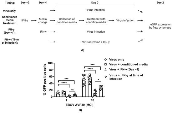 IFN-γ-induced ISG secretome does not contribute to protection conferred by IFN-γ against EBOV ΔVP30. (A) Schematic of the experiment. (B) ImKCs were untreated or treated with IFN-γ 24 h prior to infection, IFN-γ at the time of infection or conditioned media from ImKCs treated with IFN-γ. Cells were infected with EBOV ΔVP30 (MOI 1 or 10) for 48 h. Data represent the mean ± SD. p-values were obtained by one-way ANOVA (Dunnett post hoc test, *** p < 0.001; **** p < 0.0001) (Tukey post hoc test, * p < 0.05; ns = no significance). (A) Created with BioRender.com.