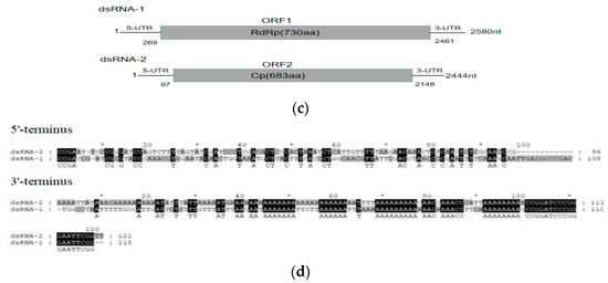 The characteristics of RsPV-BS5. (a) Electrophoresis analysis of nucleic acid samples treated with enzyme on 1% agarose gel, nucleic acid samples treated with S1 nuclease and DNase I, M indicates molecular markers; (b) RsPV-BS5 particles from strain BS-5, arrows point to the virion form. TEM images (negative staining) of the virus particles of RsPV-BS5. (c) Genomic organizations of dsRNA-1 and dsRNA-2 of a dsRNA mycovirus RsPV-BS5 in R. solani. (d) Terminal sequence domains of RsPV-BS5 genome. Identical sequences of the 5′-UTR and 3′-UTR of the two dsRNAs are reverse highlighted. An asterisk (*) indicates a distance of 10 bases from the previous number.
