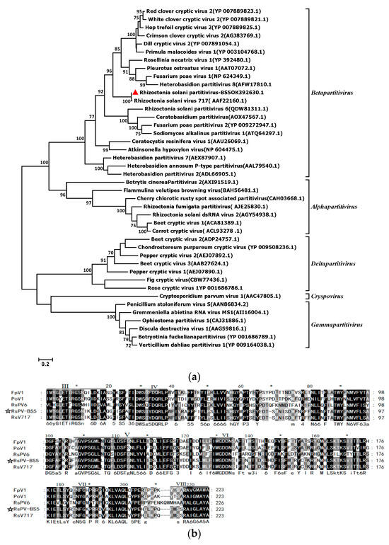(a) Phylogenetic tree based on aligning the amino acid sequences of the RdRp of RsPV-BS5 and other selected viruses of the family Partitiviridae. The tree was constructed by the maximum-likelihood method in MEGA 7 with 1000 bootstrap replicates. The mycoviral sequences in the phylogenetic tree are indicated by virus names followed by GenBank accession numbers. A red triangle showed the RsPV-BS5 in this study. (b) Multiple alignments of RsPV-BS5 RdRp domains with those of selected mycoviruses of Betapartitivirus. Number (I–Ⅷ) represented the eight conserved motifs characteristic of RdRps. An asterisk (*) indicates a distance of 10 bases from the previous number.