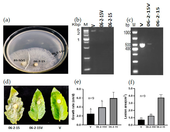 To investigate whether RsPV-BS5 could be introduced into the virus-free strain 06-2-15, the horizontal transmission potential of RsPV-BS5 was trialed in a co-culture with a donor strain BS-5 and recipient strain 06-2-15 cultures for three days, through which the newly infected RsPV-BS5 strain 06-2-15V was obtained (Figure 3a). DsRNA was detected, and total RNA was extracted for the RT-PCR detection of RsPV-BS5 using specific primers (64F2/R2) (Supplementary Table S2). The results showed that RsPV-BS5 could spread horizontally through mycelium anastomosis (Figure 3b,c). After that, the isolated tomato leaves were inoculated with the virus-free strain 06-2-15, the virus-carrying strain 06-2-15V and the virus-carrying strain BS-5 (denoted by V), which were placed on the surface of the tomato leaves for 3–5 days, and the area of disease spots was measured. In addition, the effect of RsPV-BS5 on fungal virulence was evaluated based on the sizes of the lesions on the tomato leaves caused by the three strains 06-2-15, 06-2-15V and V (Figure 3d). Three days after inoculation, the average lesion areas caused by 06-2-15V and V were smaller than those caused by 06-2-15 (Figure 3e,f), indicating that RsPV-BS5 induced hypovirulence in the horizontal transmission strain 06-2-15V. This was highly significant according to Student’s t test. Values were considered significant if p < 0.01.