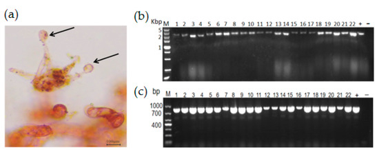 Results related to vertical transmission. (a) Basiodiospores were incubated on concave slides; the arrows point to the basiodiospores. (b) DsRNA was treated with S1 nuclease and DNase I, 1–22: single basidiospore isolation offsprings culture strains dsRNA results, +: strain BS-5 M: molecular marker, Kbp: 1000 base pairing; (c) 1–22: basidiospore culture strains RT-PCR results, +: strain BS-5, −: negative control.