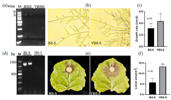 To determine the effect of the virus RsPV-BS5 on the fungal host, we tried to cure the RsPV-BS5-infected R. solani AG-3 strain BS-5, as described in Section 2, and a derivative virus-transfected strain YBS-5 was finally obtained. The mycelial morphologies of these two strains, BS-5 and YBS-5, were compared under the same conditions. The dsRNA segments present in strain BS-5 were detected, but we could not detect any in the mycelia of YBS-5 (Figure 5a). The results showed that YBS-5 was thicker than BS-5 (Figure 5b). RsPV-BS5 infection reduces mycelial growth (Figure 5c). The segment in strain BS-5 was confirmed as the genome of RsPV-BS5 through RT-PCR with the RsPV-BS5-specific primer (BS5CP-F/R) (Supplementary Table S2) using total RNA as the templates; however, it was not detected in strain YBS-5 (Figure 5d). In addition, the effect of RsPV-BS5 on fungal virulence was evaluated based on the size of the lesions on tobacco leaves caused by the two strains, BS-5 and YBS-5 (Figure 5e). After three days of inoculation, the average lesion areas caused by BS-5 were smaller than those caused by YBS-5 (Figure 5f), indicating that RsPV-BS5 induced hypovirulence.