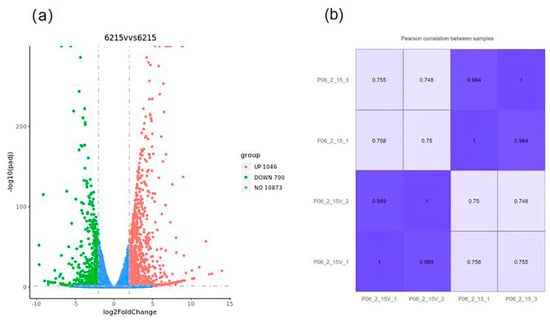Differentially expressed genes between two isogenic strains, 06-2-15V and 06-2-15 of R. solani AG-3, using the transcriptomic technique. (a) Volcano plot was a commonly used visualization tool in transcriptomic analysis to represent the significance (usually −log10(FDR)) of differential gene expression on the Y-axis and the magnitude of the fold change (logFC) on the X-axis, which indicated the extent of the difference in gene expression between the two samples; (b) Correlation check of samples 06-2-15V and 06-2-15. R2 is the square of the Pearson correlation coefficient.