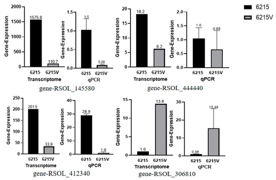 In this study, we used absolute logFC ≥ 2 and p-value ≤ 0.05 to define DEGs. A total of 1746 differential genes were obtained, of which 1046 were upregulated, and 700 were down-regulated. The “volcano plot” showed the distribution of the DEGs between strains 06-2-15V and 06-2-15 (Figure 6a). A correlation check of RNA-seq revealed similar expression patterns and R2 > 0.75 among the three biological repetitions of R. solani (Figure 6b). Compared to the gene expression data of strain 06-2-15, a total of four genes (gene-ROSL_145580, gene-ROSL_444440, gene-ROSL_412310 and gene-ROSL_306810) related to cell-wall-degrading enzymes in which the expression was altered were found in the RsPV-BS5-infected strain 06-2-15V, with three upregulated genes (gene-ROSL_145580, gene-ROSL_444440 and gene-ROSL_412310) and one down-regulated gene (gene-ROSL_306810). Gene-ROSL_145580 and gene-ROSL_444440 were supposed to encode a polygalacturonase (PG) domain-containing protein. Gene-ROSL_412310 was predicted to encode a pectin methylesterase (PE) protein. Gene-ROSL_306810 was predicted to encode β-1, 4-endoglucanase (Cx) (Figure 7).