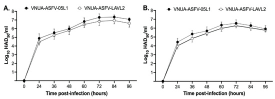 Growth curves of the VNUA ASFV-LAVL2 (passage 120) and parental VNUA-ASFV-05L1 in (A) PAMs and (B) 3D4/21 cells.