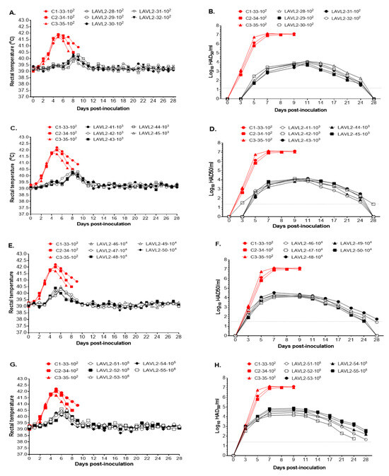Pigs vaccinated with VNUA-ASFV-LAVL2 from low dose (102 HAD50) to high dose (105 HAD50) showed transient low fever (<40.6 °C) by 7–10 DPI (peak at 8–9 DPI) (Figure 2A,C) and 5–7 DPI (peak at 5–7 DPI) (Figure 2E,G), and then showed normal body temperature during the observation period of 28 days. No obvious ASFV-specific clinical signs were observed for the vaccinated pigs. In contrast, the parental VNUA-ASFV-05L1-inoculated control pigs displayed clinical signs of ASF, including high fever, anorexia, cough, depression, staggering gait, and diarrhea. All control pigs died due to severe clinical symptoms during 8–10 DPI.