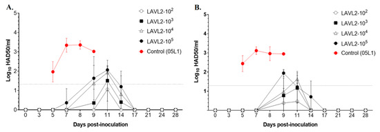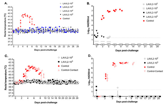 In oral fluid swabs (Figure 3A) and rectal swabs (Figure 3B), only very low viral titers (less than 102 HAD50/mL) were detected in VNUA-ASFV-LAVL2-vaccinated pigs from 9 DPI to 14 DPI, and the VNUA-ASFV-LAVL2 viruses were rapidly cleared after 17 DPI. In contrast, for the VNUA-ASFV-05L1-inoculated control pigs, viral titer in oral fluid swabs and rectal swabs reached peak titers of approximately 3.5 × 103 HAD50/mL and remained steady before they died.
