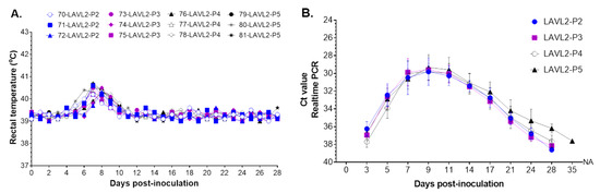 Safety of VNUA-ASFV-LAVL2 strain when passaged in pigs. (A) shows rectal temperatures of pigs from P2 to P5. (B) shows Ct values of ASFV in blood samples of pigs from P2 to P5. Data are presented as mean ± SD for pigs in each group.