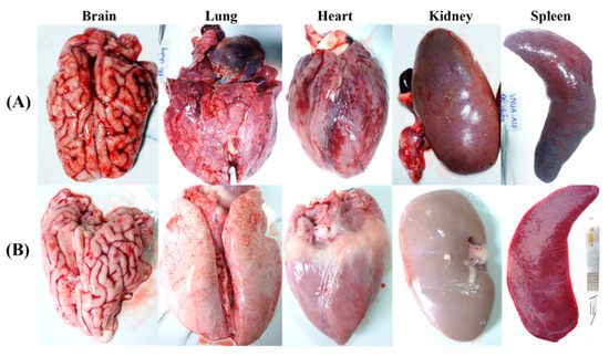 Post-mortem examination showed that non-immunized control pigs displayed characteristic lesions and pathological signs of acute ASFV infection [30]. Severe macroscopic lesions (necrosis and hemorrhage) were observed in multiple organs including mandibular, pulmonary system, mesentery in the splenic lymph nodes, renal cortex, pericardium, myocardium, and cerebral meninges, with dark and enlarged spleen, along with swollen liver and gall bladder and interstitial pulmonary oedema in non-immunized control pigs (Figure 6A). In contrast, VNUA-ASFV-LAVL2-immunized pigs exhibited no clinical and pathological signs or lesions in any of these organs (Figure 6B).