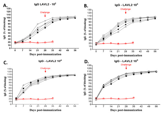As shown in Figure 7, all vaccinated pigs developed ASFV-specific antibody after immunization with VNUA-ASFV-LAVL2. ASFV-specific antibodies were detected at 21 DPI (p < 0.05) in pigs immunized with a low dose of VNUA-ASFV-LAVL2 (102 HAD50 and 103 HAD50) (Figure 7A,B), and at 7–14 DPI (p < 0.01) in those immunized with a high dose of VNUA-ASFV-LAVL2 (104 HAD50 and 105 HAD50) (Figure 7C,D). At 28 DPI, the blocking percentage (%) of ASFV-specific antibodies reached approximately 87–102%, whereas no ASFV specific antibodies were detected in the control animals prior to the challenge with VNUA-ASFV-05L1. After the challenge with VNUA-ASFV-05L1, pigs tested positive for ASFV-specific antibodies till the end of challenge’s observation period. ASFV-specific antibodies were not detected in control pigs after the challenge with VNUA-ASFV-05L1.