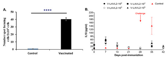 Cellular responses of VNUA-ASFV-LAVL2-vaccinated pigs and control pigs. (A) ELISPOT testing of ASFV-specific IFN-γ-producing PBMCs at 28 DPI. (B) ELISA testing to determine the serum IL-10 level of VNUA-ASFV-LAVL2-vaccinated pigs and control pigs during the vaccination period (Day 0 to Day 28) and challenge period (Day 28 to Day 42). p-values were determined using one-way ANOVA (**** p < 0.0001).