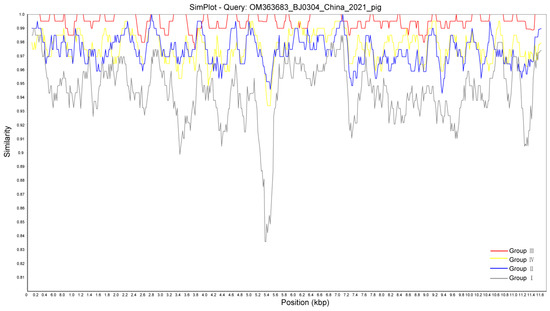 Overall, no recombination event was found within GETV strains using Simplot analysis. As shown in Figure 4, GETV-BJ0304 exhibited over 90% nucleotide sequence identity to other strains of Group I-IV from a genome-wide sequence perspective, only showing the divergence to some extent from the strains of Group I at the nsP3 position.